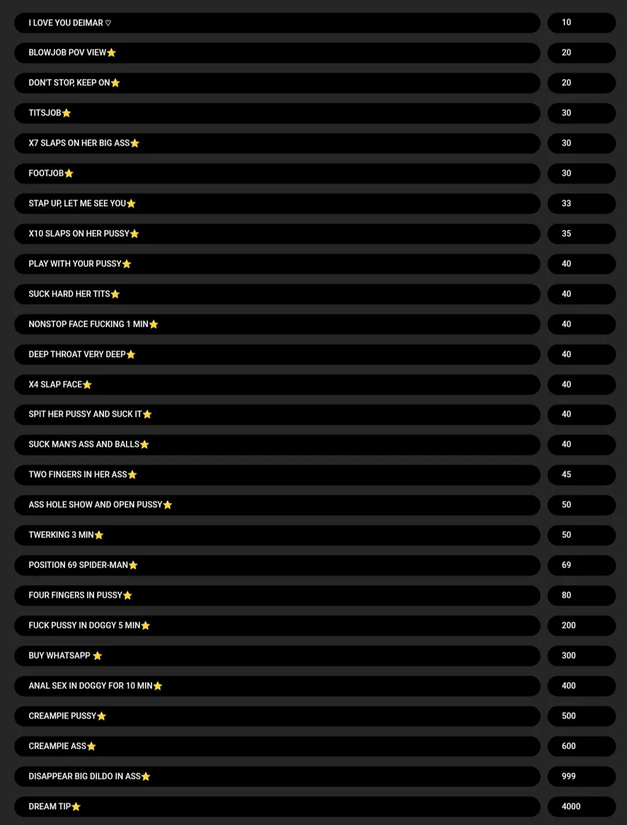 DIVIÉRTETE CON NOSOTROS Y PASA UN RATO AGRADABLE USANDO NUESTRO MENU DE PROPINAS PARA INDICAR EL ESPECTÁCULO QUE QUIERAS, GRACIAS⭐